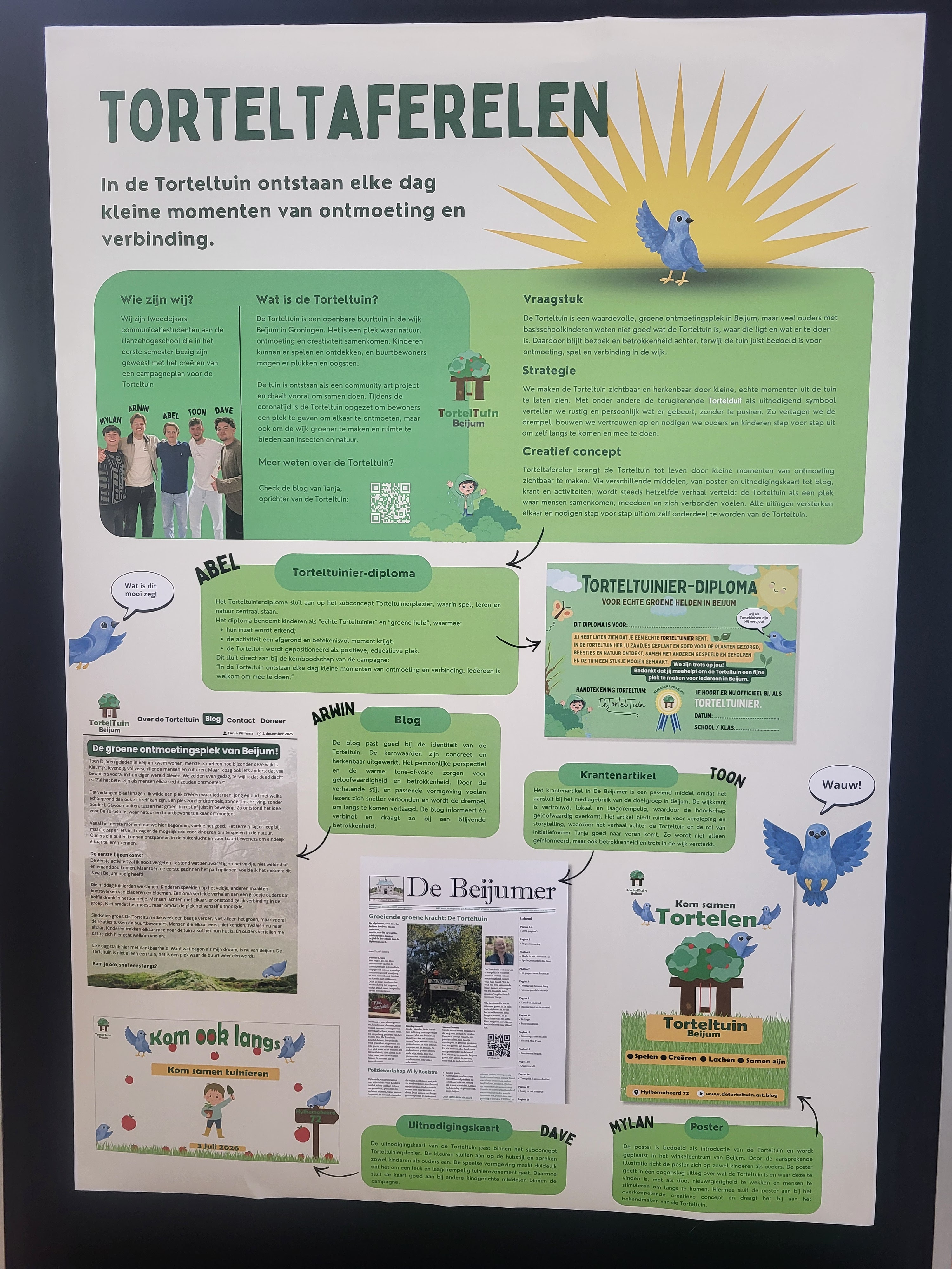 Ook ontwierpen de studenten een nieuw logo. Daarin komt een tortelduif terug, geïnspireerd op Dolly de Duif uit Pluk van de Petteflet. Een speels en zacht figuur dat staat voor verbeelding, ontmoeting en samen leven — precies waar de Torteltuin voor staat.