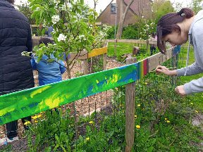 30 april was er een activiteit bij de Torteltuin om de tuin op te pimpen met veel kleurige verf. De kinderen gingen los. Het plan was ook om gemaakte beelden van vogels te beschilderen, maar die zijn nog niet klaar gekomen. Dus het nest wielen is nog leeg. De vogels komen nog en het beschilderen gebeurd met kinderen in een kleinere rustige setting. In deze periode word er ook voorgelezen uit het boek geluk voor kinderen. Waar aan de hand van 10 vogels. Echt geluk zit in het delen van geluk en het samen werken aan dromen.