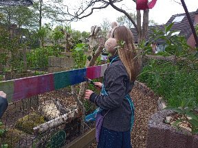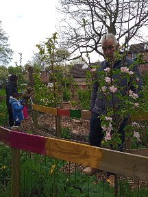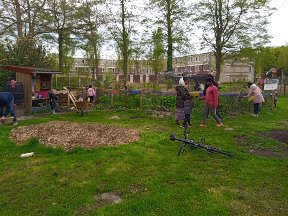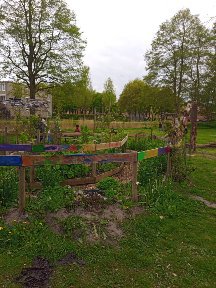 Er is stevigheid aan de tuin gegeven door de muurtjes om de borders en de paadjes beter en sterker te maken er zijn palen en gaas geplaatst en een koepeltje gemaakt in het midden van de tuin. Wat een soort begroeide chill plek is voor de kinderen. Altijd als er een tuinwerkdag is zorgt Tanja voor eten. Wat we dan buiten eten bij de picknick tafels. Het was een goed lente feest!