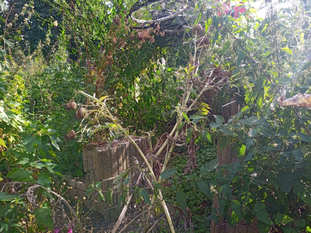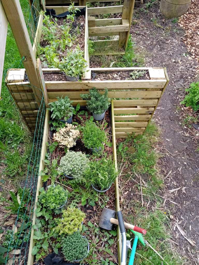 De kruiden bakken zijn ingestort door de zwaarte van de aarde, verzadigd door de regen. Dus als de bessen verplaatst zijn is er meer ruimte voorde kruiden in de tuin. Die komen dan beter tot hun recht. De bakken gaan we afbreken en het hout hergebruiken om bv. De compostbult beter te maken en het huisje.